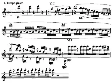 The chiming of a glockenspiel opens the symphony, followed by a melody in octaves played by the violins. This is followed in turn by active and very characteristic figures in the winds.