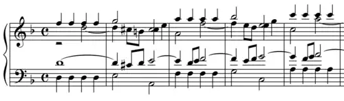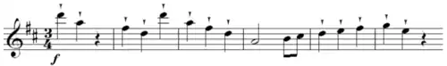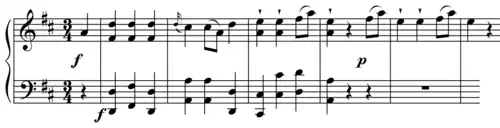 4 time, dominated by a motif established in the opening bars and consisting of two descending pairs of notes, firmly establishing the home key by using only notes in the D major triad.
