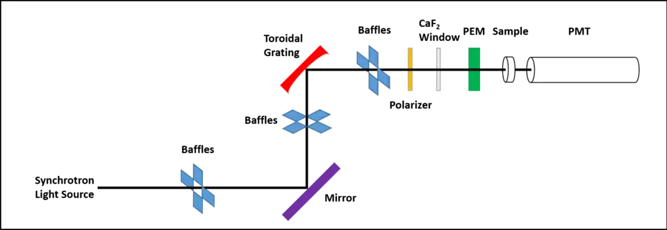 As shown in the diagram, a number of baffles are used throughout to remove possible stray light being reflected off the sides of the beamline tube. The use of only one mirror minimizes the loss of photon flux which is most important in the VUV region where reflectivity is poor relative to the visible wavelength range.[9]