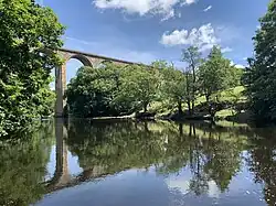 The country park lies on the banks of the River Dee and its SSSI, within the Vale of Llangollen in the Dee Valley.[2][3][4] It is situated next to and underneath the stone-built Cefn Viaduct carrying the Shrewsbury to Chester railway line.[2][3][4] It is situated 5 miles (8.0 km) south of Wrexham.[5] The park is downstream from Pontcysyllte Aqueduct has been within the boundaries of the buffer zone of the aqueduct's World Heritage Site since 2009,[6] and within the Clwydian Range and Dee Valley Area of Outstanding Natural Beauty since 2011.[2]