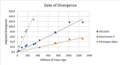 TBC1D30 has a large amount of orthologs. Analysis of these homologs allow us to ascertain the most important amino acids, i.e., the ones that are conserved. The most highly conserved amino acids among vertebrates, invertebrates, fungi, plants, bacteria and protists with available sequences were trp236, arg255, trp259, ile297, asp300, arg303, thr304, leu321, leu325, ala327, gly336, tyr337, cys338, gln339, leu349, glu356, pro399, trp432, trp450, asp451, arg463, and leu466.[21][22] The RabGAP domain within the gene originated approximately 4 billion years ago, as it is present within Terriglobus roseus,[23] which is an acidobacterium that diverged from humans 4.09 billion years ago.[24] The whole gene likely originated approximately 1.3 billion years ago, as there are still amino acids conserved past the RabGAP domain, and into the DUF4682 domain for Lithospermum erythrorhizon and Nicotiana attenuata.[23] These two plants diverged from humans about 1.275 billions years ago.[24]