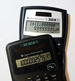- TI-30X (1993): the X signifies an expanded 10 digit display (from the original 8). Switching to a new circuit board design introduced a logarithm bug.[1]