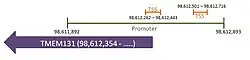 TMEM131 is located on the negative DNA strand (see Sense) of chromosome 2 from 98,372,799 - 98,612,354.[12] The gene product is a 6,657 base pair mRNA with 41 predicted exons in the human gene.[5] Ensembl predicts ten alternative splice forms, four of which are protein coding.[13] Promoter prediction and analysis was carried out using El Dorado[11] through the Genomatix software page.[14] The predicted promoter region spans 1002 base pairs from 98,611,892 through 98,612,893 on the minus strand of chromosome 2. The program predicted two potential transcriptional start locations. The first spans 216 base pairs from 98,612,501 through 98,612,716. The second spans 182 base pairs from 98,612,262 through 98,612,443.