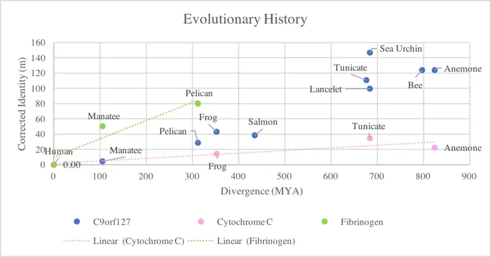 In an evolutionary comparison of TMEM8B, one species from each group (ex. Mammals, birds, fish) was plotted to avoid overabundance of information on one graph. Also plotted the comparison of the quickly diverging cytochrome C, and slowly diverging fibrinogen. TMEM8B shows divergence somewhere in-between these two proteins.