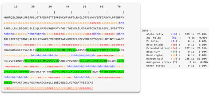Identifying the secondary structure is helpful in further analyzing the function of this protein. Alpha helices are the strongest indicators of transmembrane regions, as the helical structure can satisfy all backbone hydrogen-bonds internally. This is why the secondary structure of this protein is practical, as many of the alpha helices lie in the predicted transmembrane regions. Other key structures identified in this protein include extended strands, which are hypothesized to be important folding regions, and random coils, a class of conformations in the absence of a regular secondary structure.