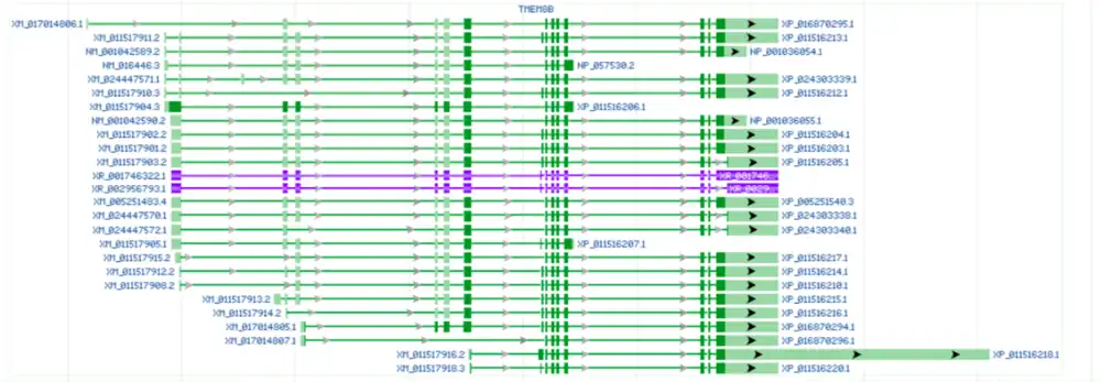 TMEM8B has 13 known mRNA splice variants in humans: Refer to the table below. All 13 variants are protein encoding, and all contain 19 exons.
