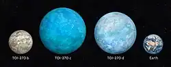 - ^ a b c Günther, Maximilian N.; Pozuelos, Francisco J.; et al. (July 2019). "A super-Earth and two sub-Neptunes transiting the nearby and quiet M dwarf TOI-270". Nature Astronomy. 3 (12): 1099–1108. arXiv:1903.06107. Bibcode:2019NatAs...3.1099G. doi:10.1038/s41550-019-0845-5. S2CID 256707535.