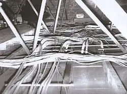 A novel but subsequently disastrous feature designed by Bell Antwerp was used to hold the subscriber's class of service information i.e. PBX, shared service, incoming calls barred (ICB), temporary out of service (TOS) etc. This was a capacitor store, and it held information on a thin plastic strip, into which could be inserted up to 10 little copper squares which had a capacitance of 10 pF. The thin plastic strips were then inserted into the Data Store rack, one at the position representing the directory number and another at the position representing the equipment number. This can be seen in the photograph together with some plastic strips hanging by wire. Hanging the strips by wire was a common practice for subscribers who were constantly changing their Class of Service, i.e. being made TOS. This information was then pulsed by the common control translator and appropriate action taken. In the end the problem turned out to be cable interference requiring substantial re-cabling at the rear of the rack. This system was replaced in later TXE exchanges by Dimond rings.