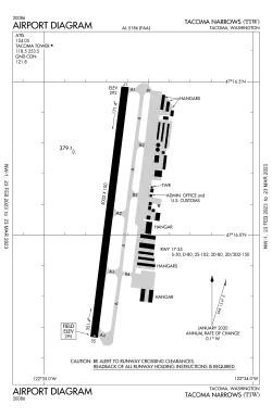 Tacoma Narrows Airport (IATA: TIW, ICAO: KTIW, FAA LID: TIW) is a county-owned, public-use airport located 5 mi (8.0 km) west of the central business district of Tacoma, a city in Pierce County, Washington, United States.[1] It is situated south of Gig Harbor, Washington, one mile southwest of the Tacoma Narrows Bridge. The airport was owned by the city of Tacoma until 2008, when it was purchased by Pierce County.[2]