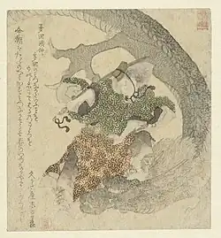 A story about the samurai Minamoto no Mitsunaka tells that, while he was hunting in his own territory of Settsu, he dreamt under a tree and had a dream in which a beautiful woman named Longnü appeared to him and begged him to save her land from a giant serpent which was defiling it.[10] Mitsunaka agreed to help and the maiden gave him a magnificent horse.[10] When he woke up, the seahorse was standing before him.[10] He rode it to the Sumiyoshi temple, where he prayed for eight days.[10] Then he confronted the serpent and slew it with an arrow.[10]