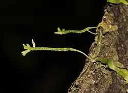 Taeniophyllum clementsii, commonly known as the fleshy threadfoot,[2] is a species of leafless epiphytic orchid which only grows as single plants. It has short stems and flattened green roots pressed against the tree on which it is growing. Between five and fifty small, pale green, tube-shaped flowers are arranged on a zig-zagged flowering stem. The flowers open one at a time, with the flowering stem increasing in length as each flower opens. This orchid only grows in a small area of tropical North Queensland.