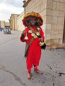 Traditionally, the garrab wears a red djellaba, and a matching large ornate hat. He carries a goatskin bag (Arabic: قِرْبَة qirba or girba) with cold fresh water, and brass cups to serve water.[1] They usually carry a bell, and have a distinct call, invoking religious themes or the good properties of the water, to attract the attention of passers-by.[3]