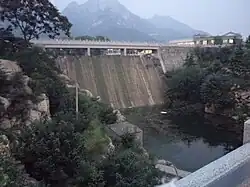 The lower reservoir is created by a 22 m (72 ft) tall and 773 m (2,536 ft) long earth-fill dam on the Pan Wen River, known as Dahe Reservoir which was first constructed in 1950s or 1960s. It can withhold up to 22,347,000 m3 (18,117 acre⋅ft) of water. The upper reservoir is created by a 99.8 m (327 ft) tall and 413.8 m (1,358 ft) long concrete-face rock-fill dam. It can withhold up to 10,430,900 m3 (8,456.5 acre⋅ft) of water, of which 8,900,000 m3 (7,200 acre⋅ft) can be used for power production. Water from the upper reservoir is sent to the 1,000 MW underground power station down near the lower reservoir through two 569.15–577.10 m (1,867.3–1,893.4 ft) long headrace/penstock pipes. The drop in elevation between the upper and lower reservoir affords a hydraulic head (water drop) of 248 m (814 ft).[2][3]