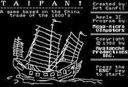 Taipan! is a 1979 turn-based strategy computer game written for the TRS-80 and ported to the Apple II in 1982.[1] It was created by Art Canfil and the company Mega Micro Computers, and published by Avalanche Productions.[1][3]