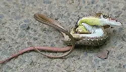 Takydromus tachydromoides, the Japanese grass lizard, is a wall lizard species of the genus Takydromus. It is found in Japan. Its Japanese name is 'kanahebi' (カナヘビ). 'Hebi' means 'snake' in Japanese, although this lizard is not a snake. There are three species of lizards found on the four main islands of Japan. The other two are the Japanese gekko (also known as Schlegel's Japanese gekko, Gekko japonicus ,or 'yamori' (ヤモリ) in Japanese) and the Okada's Five-lined Skink (Eumeces latiscutatus, also Plestiodon latiscutatus; the five lines on its back are only visible in its juvenile form).[1]