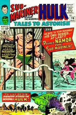 Namor the Sub-Mariner received his first feature in a decade beginning with No. 70 (August 1965).[14] The Golden Age character Byrrah was reintroduced in issue No. 90 (April 1967).[15] After the final issue of Tales to Astonish (which became the solo magazine The Incredible Hulk with issue No. 102, April 1968),[16] Namor co-starred in the split-book one-shot Iron Man and Sub-Mariner No. 1 before going on to his own 72-issue series.[3]