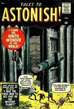 Tales to Astonish and its sister publication Tales of Suspense were both launched with a January 1959 cover date.[2] The early run of the first volume of Tales to Astonish ran from issues #1–34 (January 1959 – August 1962), initially under Atlas Comics, the 1950s forerunner of Marvel;[3] it fell under the Marvel banner with issue No. 21 (July 1961), the first with a cover sporting the early "MC" box.[4] It contained science-fiction mystery/suspense stories written primarily by editor-in-chief Stan Lee and his brother, Larry Lieber, with artists including Jack Kirby, Steve Ditko, Dick Ayers, Don Heck and Paul Reinman. One such story, "The Man in the Ant Hill", in No. 27 (January 1962), introduced the character Hank Pym,[5] who would be repurposed eight issues later as the superhero Ant-Man. Anthology stories continued to appear as backups until Tales to Astonish became a superhero "split book" in 1964, when it began featuring one story each of Giant-Man and the Hulk.[3][6]