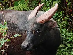 The tamaraw or Mindoro dwarf buffalo (Bubalus mindorensis) is a small buffalo belonging to the family Bovidae.[4] It is endemic to the island of Mindoro in the Philippines, and is the only endemic Philippine bovine. It is believed, however, to have once also thrived on the larger island of Luzon. The tamaraw was originally found all over Mindoro, from sea level up to the mountains (2000 m above sea level), but because of human habitation, hunting, and logging, it is now restricted to only a few remote grassy plains and is now a critically endangered species.[1]
