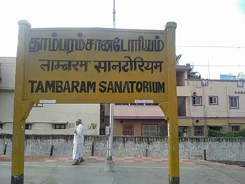 Tambaram Sanatorium railway station lies on the Madras Beach—Tambaram suburban section of the Chennai Suburban Railway, which was opened to traffic on 11 May 1931. The tracks were electrified on 15 November 1931.[1] The section was converted to 25 kV AC traction on 15 January 1967.[2] However, the station was built much later. When the Government Hospital of Thoracic Medicine expanded in the 1970s and gained importance, the railway station was built to serve the locality.[3]