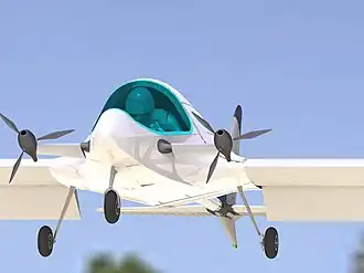 The aircraft design incorporates a pilot in prone position, retractable tricycle landing gear, folding wings, ballistic recovery parachute system, and electric propulsion motors that rotate to allow limited thrust vectoring. The thrust vectoring is intended to be used in conjunction with Fowler flaps to meet the Part 103's requirement of less than 27.6 MPH stall speed.[1] The target price for the aircraft is approximately $20,000USD.[2][3]