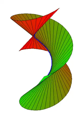 The tangent developable is a developable surface; that is, it is a surface with zero Gaussian curvature. It is one of three fundamental types of developable surface; the other two are the generalized cones (the surface traced out by a one-dimensional family of lines through a fixed point), and the cylinders (surfaces traced out by a one-dimensional family of parallel lines). (The plane is sometimes given as a fourth type, or may be seen as a special case of either of these two types.) Every developable surface in three-dimensional space may be formed by gluing together pieces of these three types; it follows from this that every developable surface is a ruled surface, a union of a one-dimensional family of lines.[2] However, not every ruled surface is developable; the helicoid provides a counterexample.