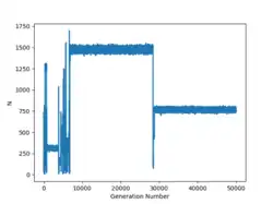 Plotting the model population over time demonstrates punctuated equilibrium, long lived quasi stable states which abruptly terminate and are replaced with new ones. During a stable period the model generates a network of mutualistic interactions between a small number of populous species, often called the 'core' and 'cloud' [10]