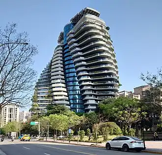 The residential building has a special appearance and is a rare twisting building, which is modeled after a DNA strand in the form of a double helix progressing 90 degrees from top to bottom, with each floor offset 4.5 degrees from the previous.[3] There is also a helipad located on the top floor. There are seven elevators inside, one of which can carry supercars and ambulances. The building is covered in approximately 20,000 trees and shrubs, which is aimed to reduce the carbon footprint of Taipei by absorbing around 130 tonnes of carbon dioxide emissions each year.[4][5]