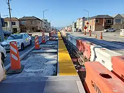 Construction on the first phase of the project, between 33rd Avenue and 46th Avenue, began in September 2019.[9] When Muni Metro service resumed on August 22, 2020, after a five-month closure during the COVID-19 pandemic, L Taraval service remained suspended west of Sunset Boulevard for construction. Trains reversed direction using the crossover west of 35th Avenue, with the westbound platform at Sunset serving as the terminal.[10][2] Rail service was re-replaced with buses on August 25 due to issues with malfunctioning overhead wire splices and the need to quarantine control center staff after a COVID-19 case.[11]