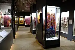 The jewellery collection includes thousands of individual pieces, reflecting a wide range of styles, materials, and techniques. Some notable examples include a Turkoman 'asyk' from Afghanistan or Iran, and a 'hunkun' or 'hirz' necklace from the Sultanate of Oman, adorned with gold decorations and Empress Maria Theresa thalers.[14][31] Enamelled silver jewellery belonging to the last Amirs of Bukhara (circa 1885–1920) are also on display.[25]
