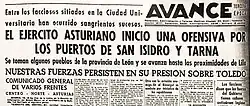 During the first days of battle, there was a rapid mobilization of the workers who managed to reduce the coup plotters in Asturias: Faced with the appearance that the coup had already passed, more than 2,000 Asturian militiamen immediately left[17] towards León and Ponferrada, but Aranda, colonel of Oviedo, took advantage of that moment to rebel and launch their forces into the street. As a result, the city of Oviedo became surrounded by Aranda and his army inside.