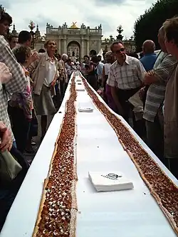 The type of pastry used for tarte aux mirabelles varies. The most frequently mentioned in recipes is pâte brisée,[5][6] but other sweet pastries – pâte sablée and pâte sucrée – are specified by some cooks,[7][8][9] and unsweetened shortcrust and puff are also used in some recipes.[10][11] In Beaulieu-sur-Dordogne, Elizabeth David encountered a tarte aux mirabelles made with yeast pastry: "Those little round golden plums of early autumn on their light brioche-like base made an unexpected and memorable end to our outdoor feast".[4]