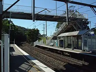 For many years, the suburb was in four distinct parts; the area to the north of the station and west of the line, the area of waterfront adjacent to Point Clare, the area west of the station, and the area around Thomas Street. The dangerous level crossing at the station ceased to be used by cars some time in the 1960s. The level crossing near Thomas Street closed in 1963.[37] Both crossings never had warning signals, just farm-style gates. For many years afterwards, pedestrians continued to cross the line at both these locations—including to access the Up platform at the station or catch the bus on Brisbane Water Drive—before the pedestrian overbridge was built at the station and the level crossing at the station was officially closed in 1984.[38] The extension of Glenrock Parade, from the north of the station through to Koolewong, finally provided safe road access to the entire area of Tascott. Prior to late 1970, the section of the road—now part of Glenrock Parade—that intersected Thomas Street was known as Tascott Parade.[39]