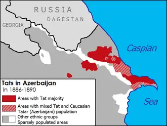 The 1886–1892 Tsarist population figures counted 124,683 Tats in the Russian Caucasus of which 118,165 were located in the Baku Governorate and 3,609 in the Dagestan Oblast.[8] The 1897 Russian Empire census recorded 95,056 Tats, of which 89,519 were in the Baku Governorate and 2,998 in the Dagestan Oblast.[8] The 1926 Soviet census only counted 28,705 Tats of which 28,443 were in the Azerbaijan SSR and 1,237 in the Dagestan ASSR.[8] Arthur Tsutsiev notes that a major portion of Tats in the 1926 census were listed under the categories "Persians" and "Azerbaijani Turks".[9] This was particularly the case within the Azerbaijan SSR, where some 38,327 individuals were recorded as "Turks whose native language is Tat".[10] The 1979 Soviet census counted 22,441 Tats of which 8,848 were located in the Azerbaijan SSR and 7,437 in the Dagestan ASSR.[8]