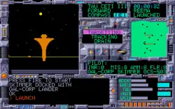The gameworld is displayed in a 3D view from the skimmer. As well as displaying these 3D graphics, Cooke's game engine renders them with simple shadows in order to simulate the day and night cycle of Tau Ceti III. These days are much shorter than Earth's consisting of one spin of the planet per hour with sixteen "spins" to a Cetian day.