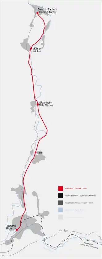 Just after leaving the station of Bruneck and after crossing the Rienz, the track followed the Ahr river until the final station in Taufers. Only two bridges were necessary to build the line. One in Uttenheim over the Ahr river and one in Mühlen in Taufers over the Mühlwalder brook. The train stations coming from Bruneck to Taufers were St. Georgen, Gais, Uttenheim, Mühlen in Taufers, Kematen and Taufers.