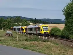 In 1988, a special association of 13 towns, municipalities and the Hochtaunus district founded the Verkehrsverband Hochtaunus (High Taunus transport association, VHT).[2] The line from Grävenwiesbach to Friedrichsdorf (a station now served by the S-Bahn) was still open but threatened with closure, but it was taken over by the VHT in 1989. This was followed by an extensive modernisation of the signaling technology and of the stations over 18 months.[7] The formerly parallel bus service was converted into a feeder route.