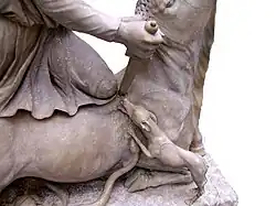 With his left hand, Mithras pulls back the head of the bull by the nostrils or the muzzle (never by the horns,[11] which – if at all represented – are short). In his right hand, Mithras usually holds a knife or short sword plunged into the neck/shoulder of the bull. Alternatively (CIMRM 2196), the knife is sticking into the bull's neck, and Mithras has his arm raised as if in triumph. Mithras is usually dressed in a knee-length long-sleeved tunic (tunica manicata), closed boots and breeches (anaxyrides, bracae). Mithras' cape, if he wears one, is usually spread open, as if flying. Occasionally, Mithras is nude (CIMRM 2196, 2327; 201; 1275).[12] On his head, Mithras usually wears a phrygian cap, like the one worn by Attis. The tail of the bull occasionally appears to end in an ear of wheat. The blood from the wound is also sometimes depicted as ears of wheat, or as a cluster of grapes.[13]