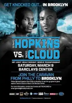 In his last fight, Bernard Hopkins had lost the WBC and The Ring light heavyweight titles to Chad Dawson on April 28, 2012. It was not immediately known if the 47-year old Hopkins would fight again, with Hopkins himself expressing to the media "I could be a mentor in the game if I choose to go out that way" after the fight.[2] However, in November of that year, it was announced by Golden Boy Promotions CEO Richard Schaefer that Hopkins would indeed return on March 9, 2013, to face one of the reigning light heavyweight champions at the time; IBF champion Tavoris Cloud, WBO champion Nathan Cleverly or WBA champion Beibut Shumenov at the Barclays Center in Brooklyn.[3] The following month, Cloud was officially announced to be Hopkins opponent, with the IBF approving the fight in January after both fighters agreed to face mandatory challenger Karo Murat should they win.[4][5] The bout was planned to be aired on Showtime's Showtime Championship Boxing, but HBO, who had long broadcast Hopkins fights, stepped in and made a deal with Golden Boy Promotions to air the fight instead.[6]