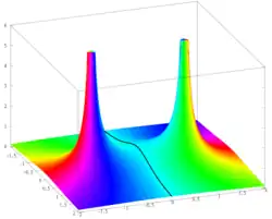 Complex plot of . Modulus is shown by elevation and argument by coloring: cyan = , blue = , violet = , red = , yellow = , green = .