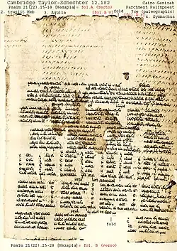 The siglum Taylor-Schechter 12.182 (T-S 12.182; also referenced as TM nr. 62326; LDAB id: 3490; Rahlfs 2005) designates a manuscript written on parchment in codex form.[1] This is a palimpsest of a copy of Origen's work called the Hexapla. The manuscript is dated to 7th-century AD,[2] and is the oldest of the hexapla manuscripts.[3] The hexapla was completed before 240 AD.