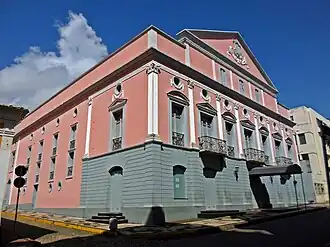 The theatre was the second theatre in Brazil, completed in 1817.[1] Two Portuguese merchants, Eleutério Lopes da Silva Varela and Estevão Gonçalves Braga, had the idea of building a theatre of proportions they had seen in Lisbon in 1815, during the Maranhão cotton boom.[2] It was built after the model of Italian theatres in horseshoe-shape with balconies,[1] in neoclassical style.[2] It was named Teatro da União, opened on 1 June 1817.[2] It seated 800 spectators, or 5% of the citizens at the time.[2] In 1852 it was named Teatro São Luiz,[2] and in 1922 renamed again, after the poet and playwright Artur Azevedo in 1922.[1]