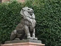 Bronze statues of the classical muses are installed on the roof above the entrance. The statues are 3.5m high and were ordered from Ohio. Due to a long delay in delivery, it was decided to install only eight of the nine muses, although the missing one, Erato, might be represented in Urania's globe.[7]