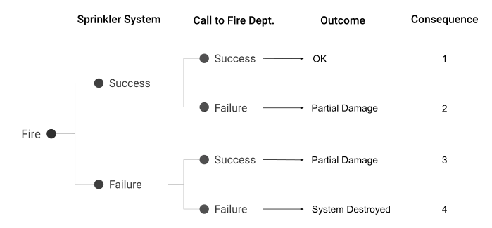 An event tree visually displays all events that occur within a system. It starts off with an initiating event, then branches develop as various consequences of the starting event. These are represented in a number of different paths, each associated with a probability of occurrence. As mentioned previously, the tree works on a binary logic, so each event either succeeds or fails.