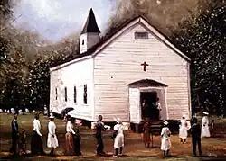 The Church-related themes in his art he attributes to formative experiences with his mother at their local house of worship, "Beulah Land Church".[9]