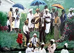 African American history and African American culture play central roles in Ellis' art, which regularly feature themes like Buffalo Soldiers, cotton fields, and Jazz music;[14] his Jazz works especially lean towards the impressionistic. Other common themes range from fisherman to religious scenes[15] as in Thee Baptism, My Father's Baptism, and Deacon's Door, to African ethnic scenes like Afrimage and Ashanti.[7]