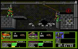 The goal of the game is to complete a number of missions, consisting of levels divided into screens, culminating in a final battle with The Shredder. The gameplay is similar to the original Prince of Persia, as characters switch between free movement and melee fighting stances in a two-dimensional platformer environment.[2] In between missions the Turtles can rest, regaining lost hit points, but the player only has a limited amount of time in which to find the Shredder. The game is designed to be played with a keyboard, and utilizes a key to switch between walking and fighting modes. Each Turtle has the ability to arm and withdraw his weapon. Each Turtle wields his signature weapon and a number of shuriken. Holding the enter key makes the Turtles attack, and the spacebar is used to block enemy attacks based on which arrow key is held.
