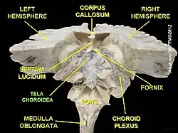 The tela choroidea (or tela chorioidea) is a region of meningeal pia mater that adheres to the underlying ependyma, and gives rise to the choroid plexus in each of the brain’s four ventricles.[1][2] Tela is Latin for woven and is used to describe a web-like membrane or layer.[3] The tela choroidea is a very thin part of the loose connective tissue of pia mater overlying and closely adhering to the ependyma.[2][1] It has a rich blood supply. The ependyma and vascular pia mater – the tela choroidea, form regions of minute projections known as a choroid plexus that projects into each ventricle.[1][2] The choroid plexus produces most of the cerebrospinal fluid of the central nervous system that circulates through the ventricles of the brain, the central canal of the spinal cord, and the subarachnoid space.[4][2] The tela choroidea in the ventricles forms from different parts of the roof plate in the development of the embryo.[2][1]