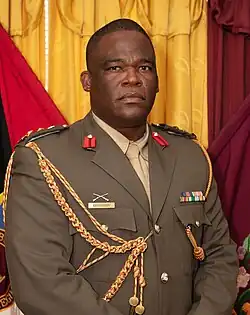Telbert Benjamin (b. 18 December 1974) is a brigadier general in the Antigua and Barbuda Defence Force, serving as the second Chief of Defence Staff since 21 March 2020. Benjamin was born in Liberta in 1974 and has two children. Benjamin was also commanding officer of the Antigua and Barbuda Regiment from 2020 until 2021.[1][2] He was promoted to the rank of brigadier general on 26 August 2024 by Rodney Williams.[3]