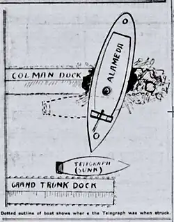 On the night of April 25, 1912, Telegraph was berthed at Colman Dock in Seattle, when the heavy iron steamship Alameda collided with Telegraph, nearly cutting the sternwheeler in two.[18] Alameda then crashed into the dock, knocking its famous clocktower into the water.[18] The famous captain John A. "Dynamite Johnny" O'Brien,[19] as pilot, was in charge of Alameda at the time.[18] O'Brien was maneuvering Alameda into a berth, and in so doing gave the signal "full astern" to the engine room, which for some reason was picked up as "full ahead."[18]