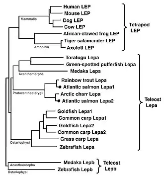 There are two closely related lep paralogues in Atlantic salmon (Salmo salar).[6] A single lep gene has been documented for green-spotted pufferfish (Tetraodon nigroviridis),[5] rainbow trout (Oncorhynchus mykiss),[7] Arctic charr (Salvelinus alpinus),[8] silver carp (Hypophthalmichthys molitrix), and grass carp (Ctenopharyngodon idellus).[9] In other species there are reports of two closely related lep paralogues, including common carp (Cyprinus carpio)[10] and Atlantic salmon.[6] More distantly related lep genes have been found in medaka (Oryzias latipes)[11] and zebrafish (Danio rerio).[12] At least 2 leptin genes (lepa and lepb) exist in the crown-clade (Fig. 1).[5][10][11][12] Early findings have shown that lepa and lepb share low interspecies aa identity, and are argued to have arisen through whole genome duplication,[5] which occurred early in the teleost lineage.[13] The duplicity of genes has been described for Atlantic salmon, Japanese medaka, common carp and zebrafish.[6][10][11][12] Both lep paralogues[6] cluster with lepa, and therefore suggest that at least one or more form (lepb) may exist in this species, since it is tetraploid.[14] However, previous attempts using genomic synteny have only found the putative genomic duplicates in medaka and zebrafish paralogue.[11][12] Currently it remains unclear, whether lepb exists in other teleosts due to the degenerative nature of this paralogue.